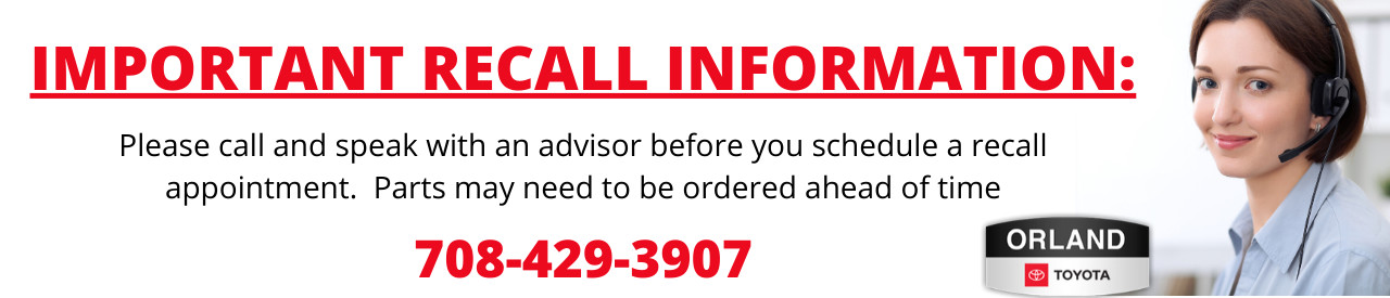 Your car is important to you, and your safety is important to Orland Toyota. Recalls are no charge and provide a safe vehicle for the consumer to continue driving. While typically voluntary it is imporatant to to resolve any outstanding issues for both safety and liablity reasons. Please call our service team in order to expedite this process.